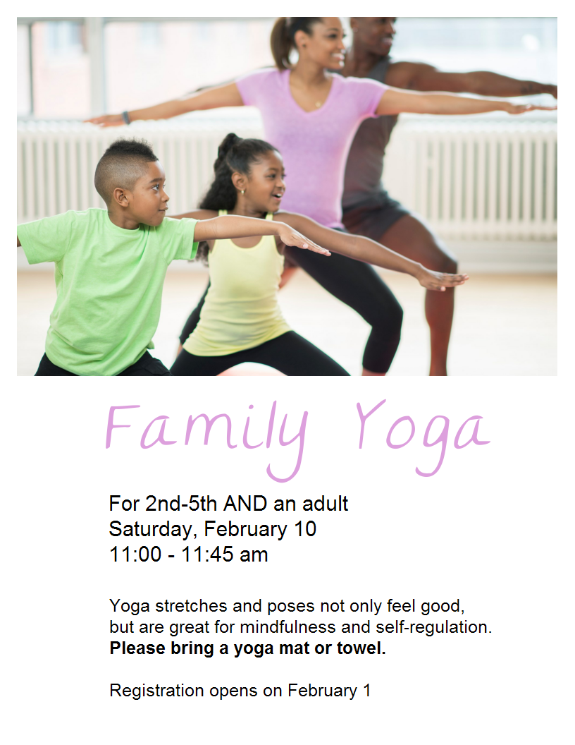 03/09/24 @ 11:00am – 03/09/24 @ 11:45am Community Room A and B South Country Library Registration is required. Registration starts: 03/01/2024 @ 9:30am Registration end: 03/09/2024 @ 11:00am For 2nd-5th AND an adult. Yoga stretches… Family Yoga [2nd-5th AND an adult]