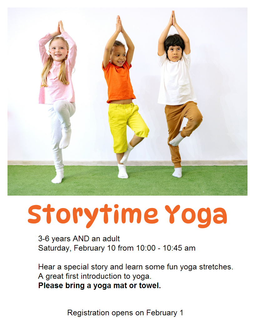 03/09/24 @ 10:00am – 03/09/24 @ 10:45am Community Room A and B South Country Library Registration is required. Registration starts: 03/01/2024 @ 9:30am Registration end: 03/09/2024 @ 10:00am For 3-6 years AND an adult. Hear… Storytime Yoga [3-6 years AND an adult]