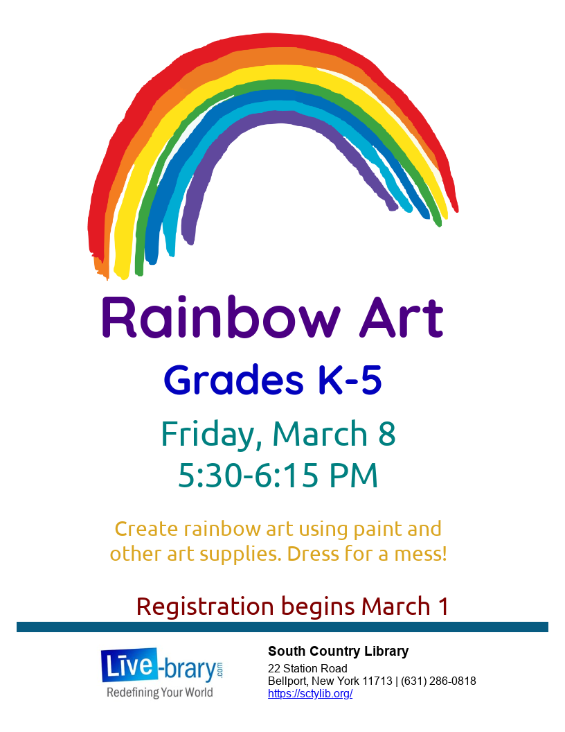 03/09/24 Children’s Area South Country Library All ages, no registration, while supplies last. Pick up a simple craft kit in the Children’s Dept. Because of demand, there is a limit of 5 kits per family.… Craft Kit Giveaway [All ages]