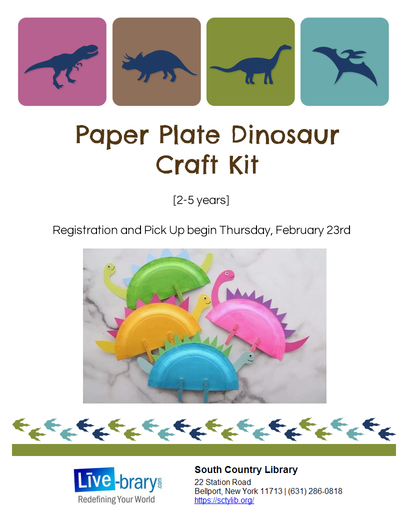 02/23/24 Children’s Area South Country Library Registration is required. Registration starts: 02/23/2024 @ 9:30am Registration end: 03/25/2024 @ 9:00pm For 2-5 years. Make a fun dinosaur out of a plate and clothespins! Registration and pick-up… Paper Plate Dinosaur [2-5 years]