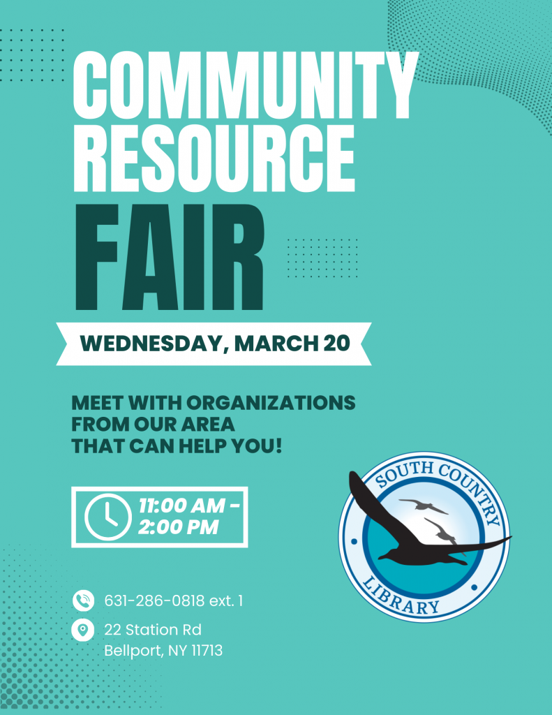 03/20/24 @ 11:00am – 03/20/24 @ 2:00pm Main Floor South Country Library Join us for our next Community Resource Fair on Wednesday, March 20th from 11am-2pm! We’ll be hosting an array of organizations from our area that can help you. Read More …