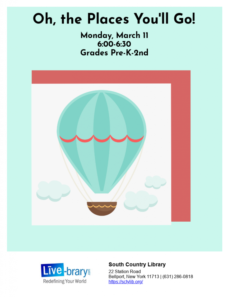 03/11/24 @ 6:00pm – 03/11/24 @ 6:30pm Community Room B South Country Library Registration is required. Registration starts: 03/01/2024 @ 9:30am Registration end: 03/11/2024 @ 6:00pm For Pre-K – 2nd AND an adult. Celebrate Dr. Seuss’ birthday by making a Read More …