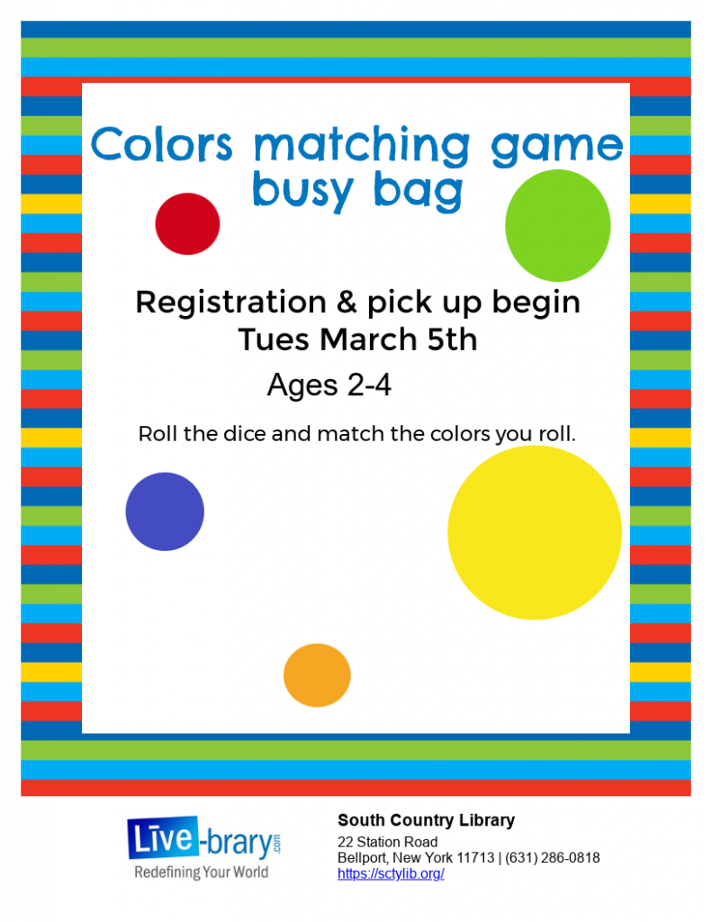 03/05/24 Children’s Area South Country Library Registration is required. Registration starts: 03/05/2024 @ 9:30am Registration end: 04/05/2024 @ 9:00pm For 2-4 years. Roll the dice and match the colors you roll. Registration and pick-up of this kit begins on March Read More …