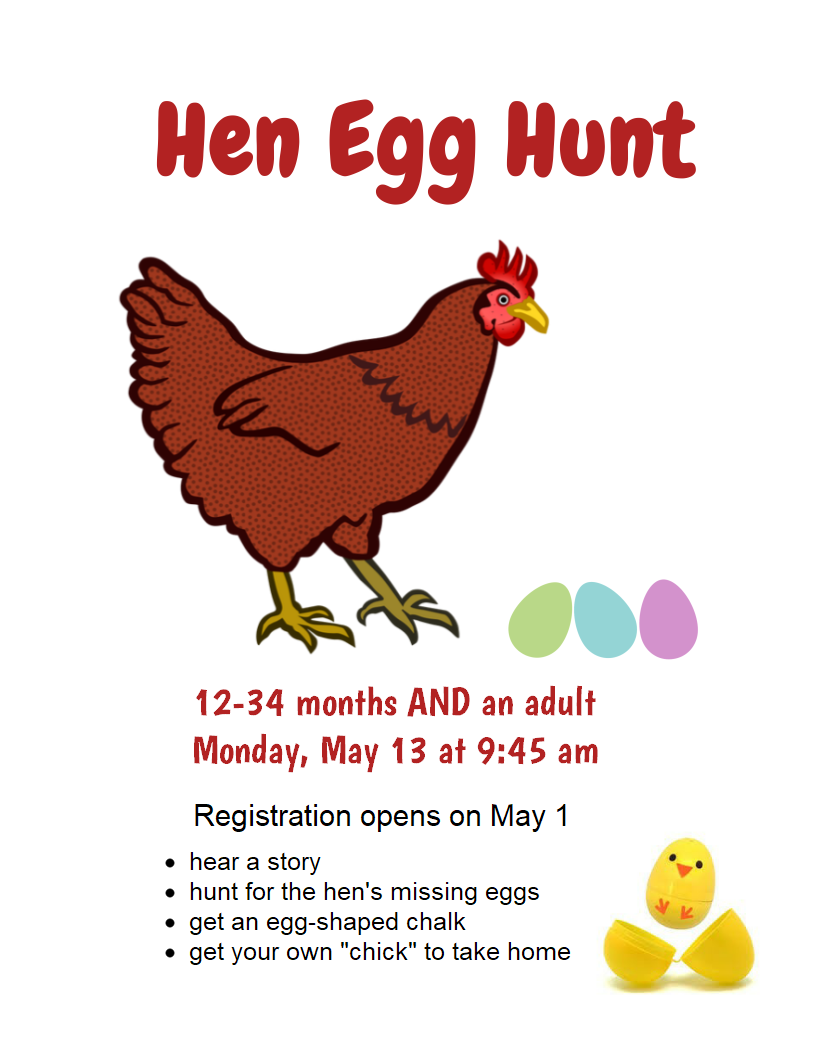 05/13/24 @ 9:45am – 05/13/24 @ 10:30am Children’s Area South Country Library Registration is required. Registration starts: 05/01/2024 @ 9:30am Registration end: 05/13/2024 @ 9:45am For 12-34 months AND an adult. Join us for a… Hen Egg Hunt [12-34 months AND an adult]