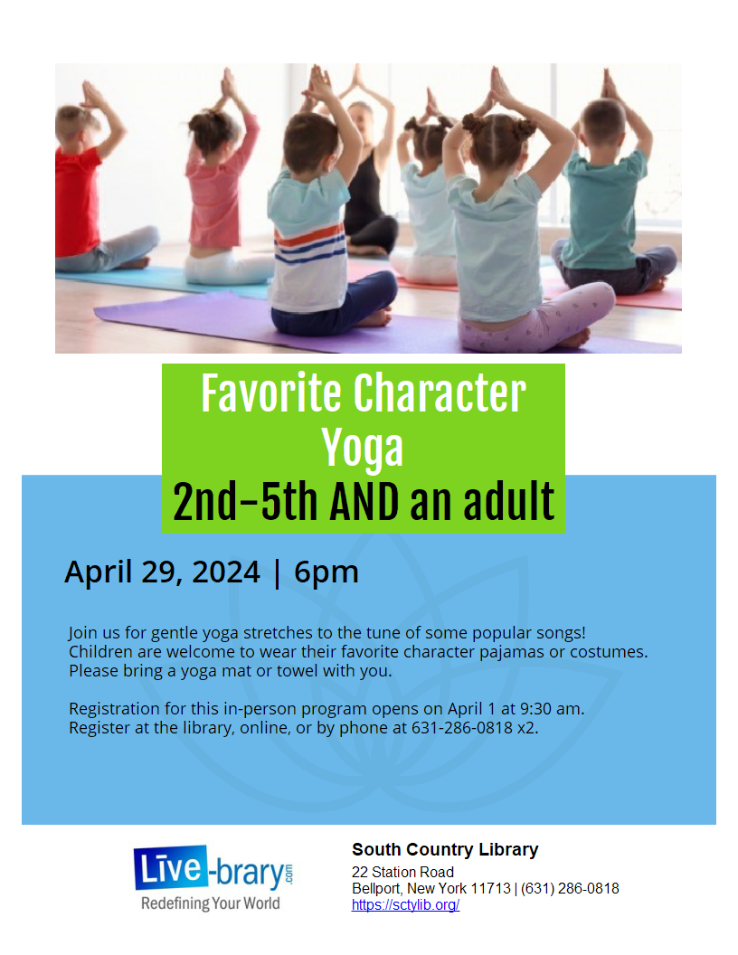 05/01/24 South Country Library Registration is required. Registration starts: 12/31/1969 @ 7:00pm Registration end: 05/01/2024 @ 12:00am Create beautiful origami paper flowers. Registration opens May 1. Pickup begins May 15. *South Country Library card required*