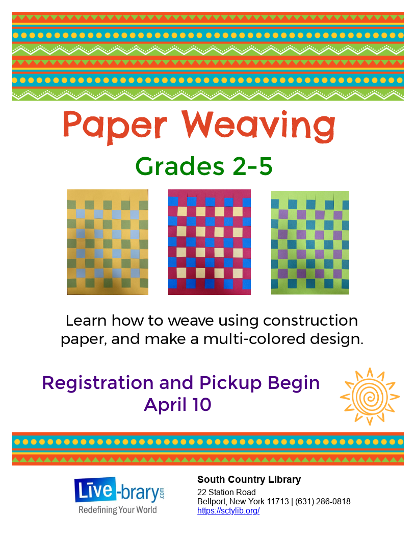 04/10/24 Children’s Area South Country Library Registration is required. Registration starts: 04/10/2024 @ 9:30am Registration end: 05/10/2024 @ 9:00pm For 2nd-5th. Learn how to weave using construction paper, and make a multi-colored design. Registration and… Paper Weaving [2nd- 5th]