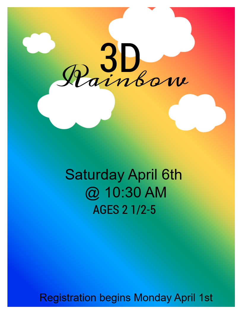 04/06/24 @ 10:30am – 04/06/24 @ 11:00am Children’s Program Room South Country Library Registration is required. Registration starts: 04/01/2024 @ 9:30am Registration end: 04/06/2024 @ 10:30am For 2.5 – 5 years AND an adult. Color… 3D Rainbow [2.5-5 years AND an adult]