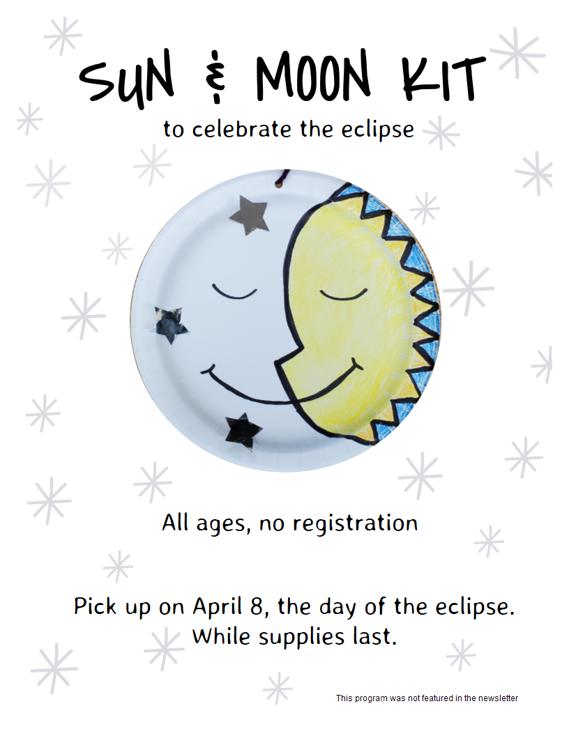 04/08/24 Children’s Area South Country Library All ages, no registration, while supplies last. Celebrate the eclipse with this craft!