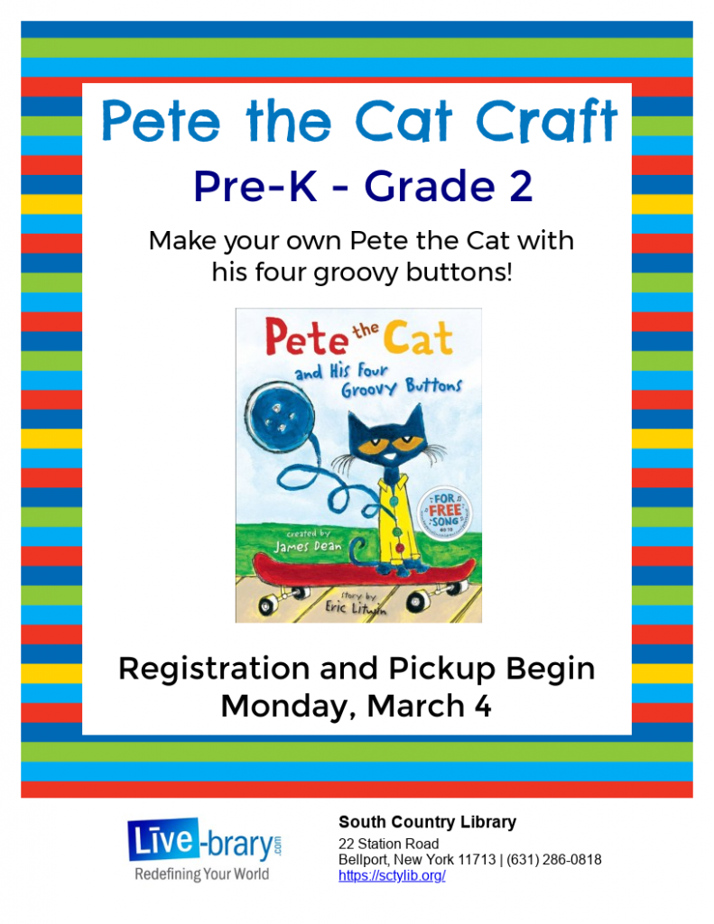 03/04/24 Children’s Area South Country Library Registration is required. Registration starts: 03/04/2024 @ 9:30am Registration end: 04/04/2024 @ 9:00pm For Pre-K – 2nd. Make your own Pete the Cat with his four groovy buttons! Registration and pick-up of this kit Read More …
